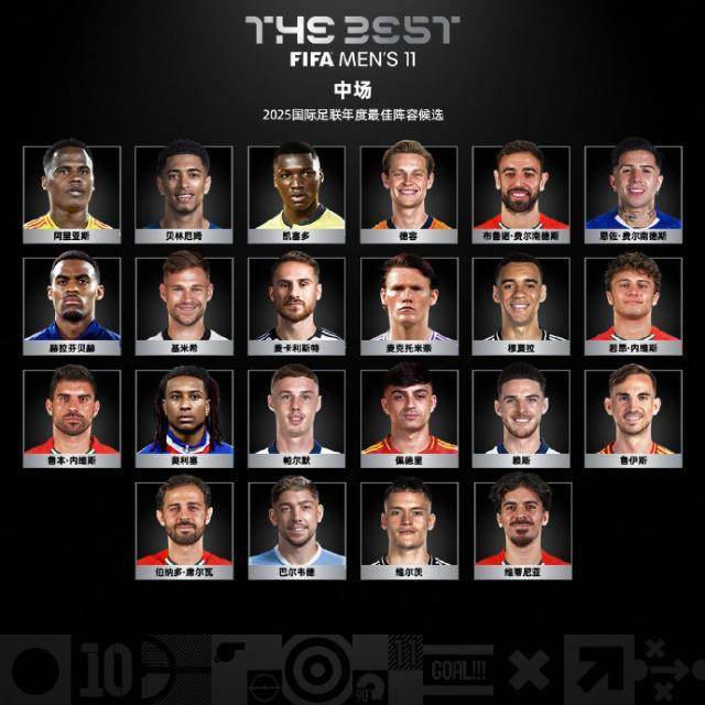 国际足联(FIFA)公布2025年度各项集体及个人大奖候选名单,名单由国际足联及其他足球相关机构代表组成的专家小组制定。其中男子最佳球员(足球先生)11名候选、女子最佳球员17名候选;男子最佳门将8名候选、女子最佳门将7名候选;男子最佳教练7名候选,女子最佳教练5名候选;男女子最佳阵容各个位置分别22名候选。